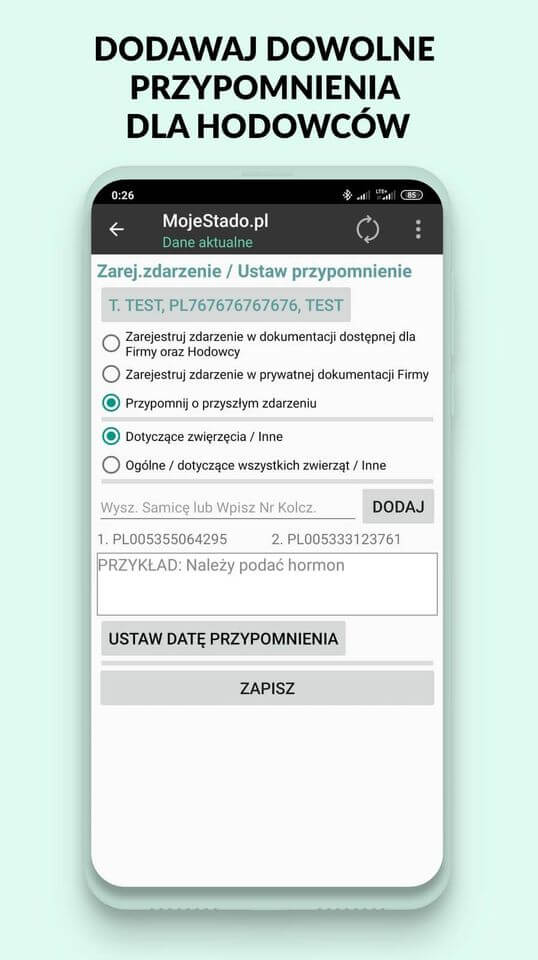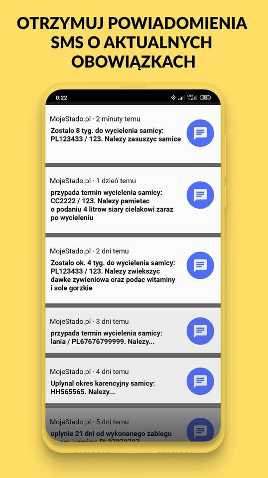 MojeStado.pl automatycznie wysyła powiadomienia SMS i przypomnienia w aplikacji na podstawie wykonanych zabiegów i zdarzeń. Dzięki temu nie musisz pamiętać o kolejnych krokach – system sam informuje Cię, co i kiedy należy zrobić przy konkretnym zwierzęciu.