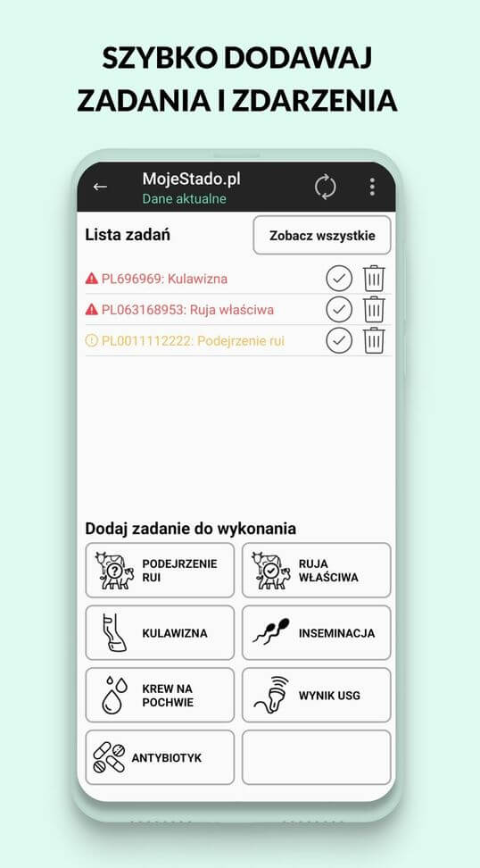 MojeStado.pl to aplikacja dostępna na telefonie oraz w przeglądarce, która zbiera w jednym miejscu wszystkie informacje o stadzie. Każde zdarzenie – inseminacja, ruja, leczenie, badanie czy wycielenie – jest zapisywane przy konkretnym zwierzęciu i tworzy jego pełną historię.